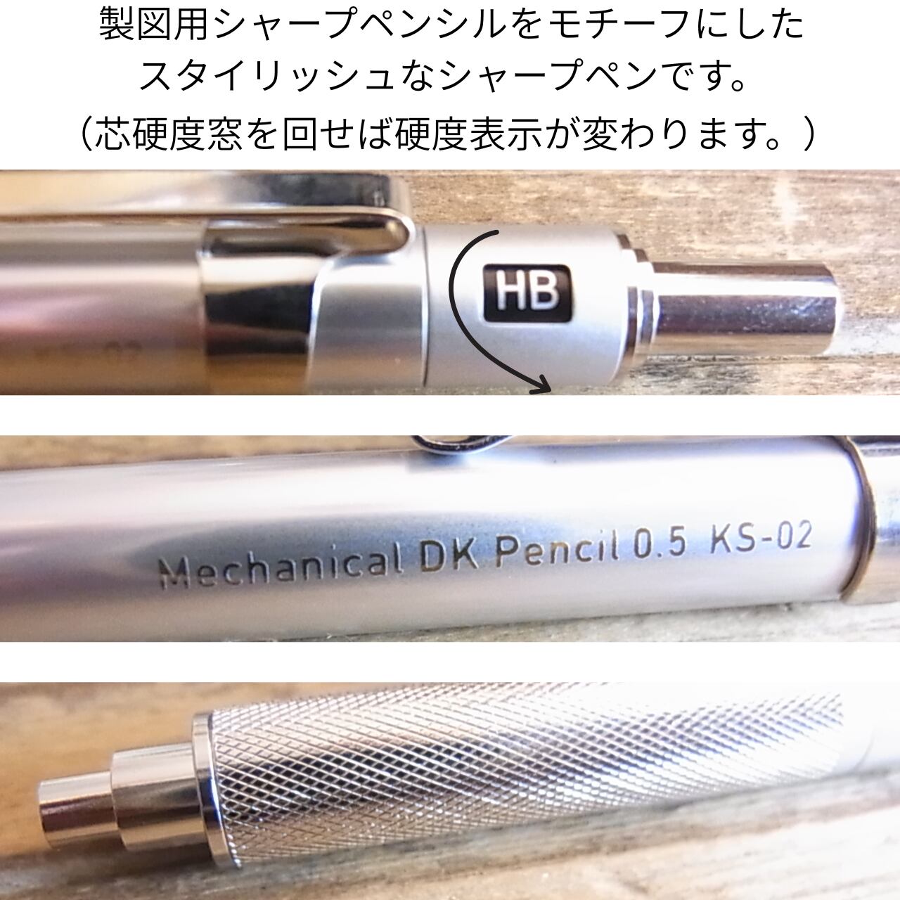 芯硬度表示窓: 製図用シャープペンシルの証である芯硬度表示窓を搭載。HBやBなど、使用している芯の硬度を回して表示でき、複数のシャープペンの芯硬度を使い分ける際にも便利です。(画像2参照)