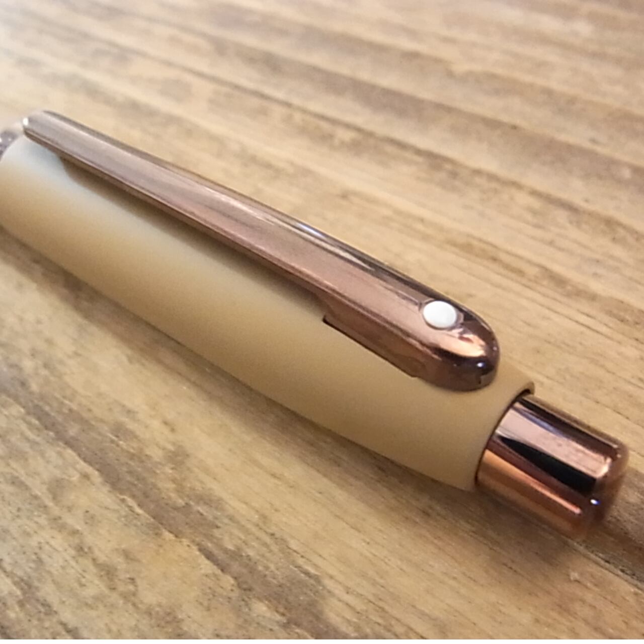 VFMボールペン:まるで淹れたてのコーヒーのようなライトブラウンの美しいグラデーション。クリップ裏にはコーヒーカップのデザインをさりげなく刻印。なめらかな書き心地で、ノック式で使い勝手も抜群です。