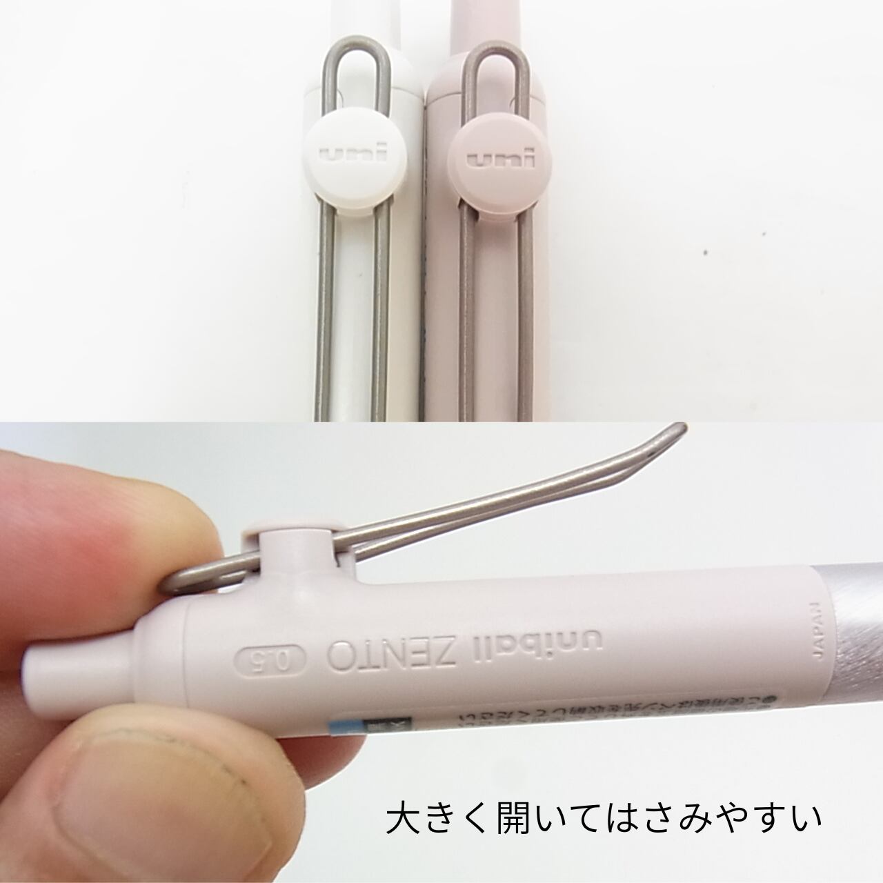 軸色に合わせたシンプルでスタイリッシュなクリップは、大きく開く可動式。厚手の手帳やファイルにもしっかりと挟め、どこへでも簡単に持ち運べます。