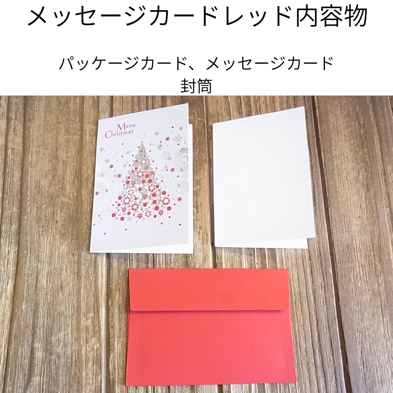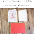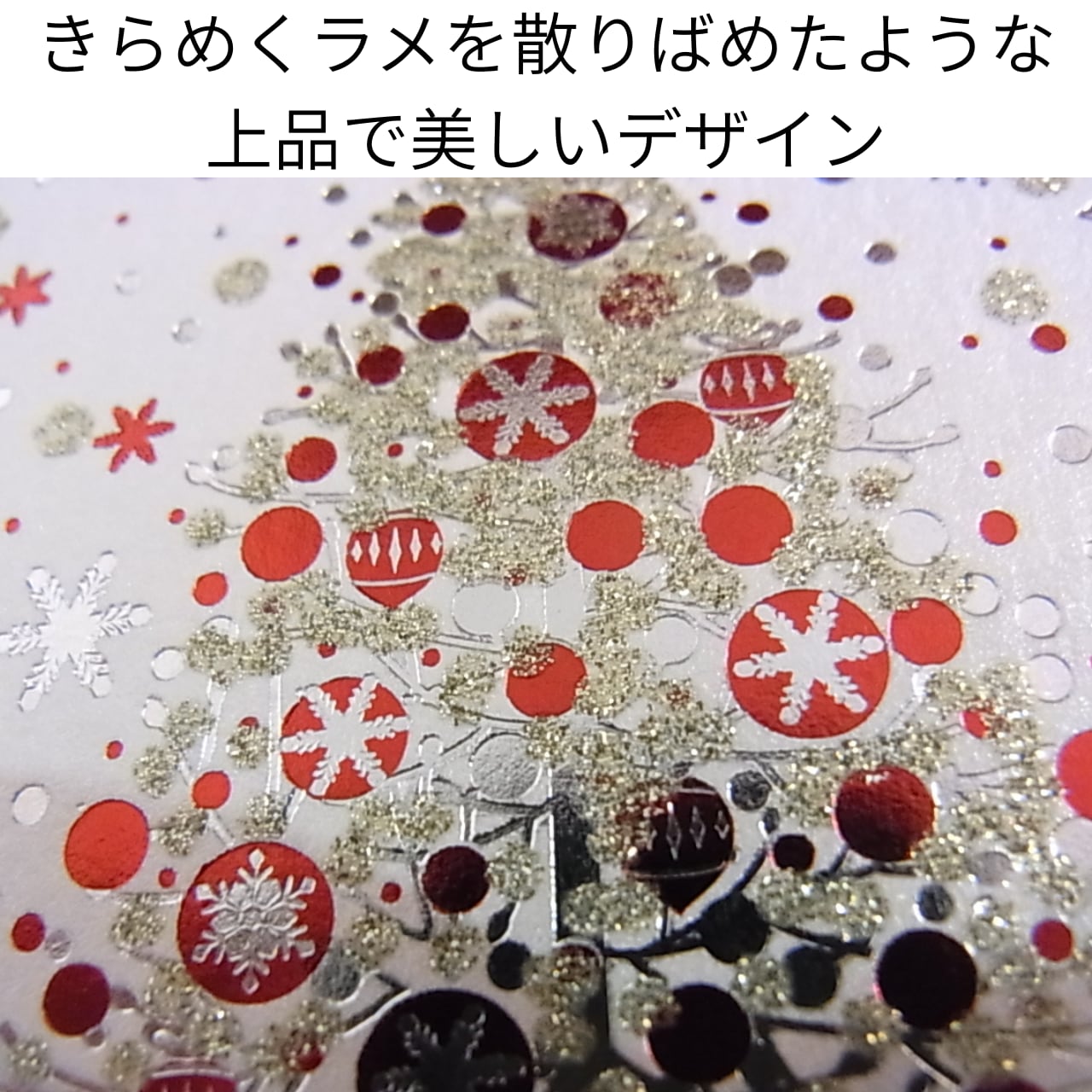 華やかな赤とシルバーのラメを使用し、雪の結晶やオーナメントが散りばめられたクリスマスツリーが描かれています。定番で愛らしい雰囲気で、ギフトに添えると一層華やかになります。