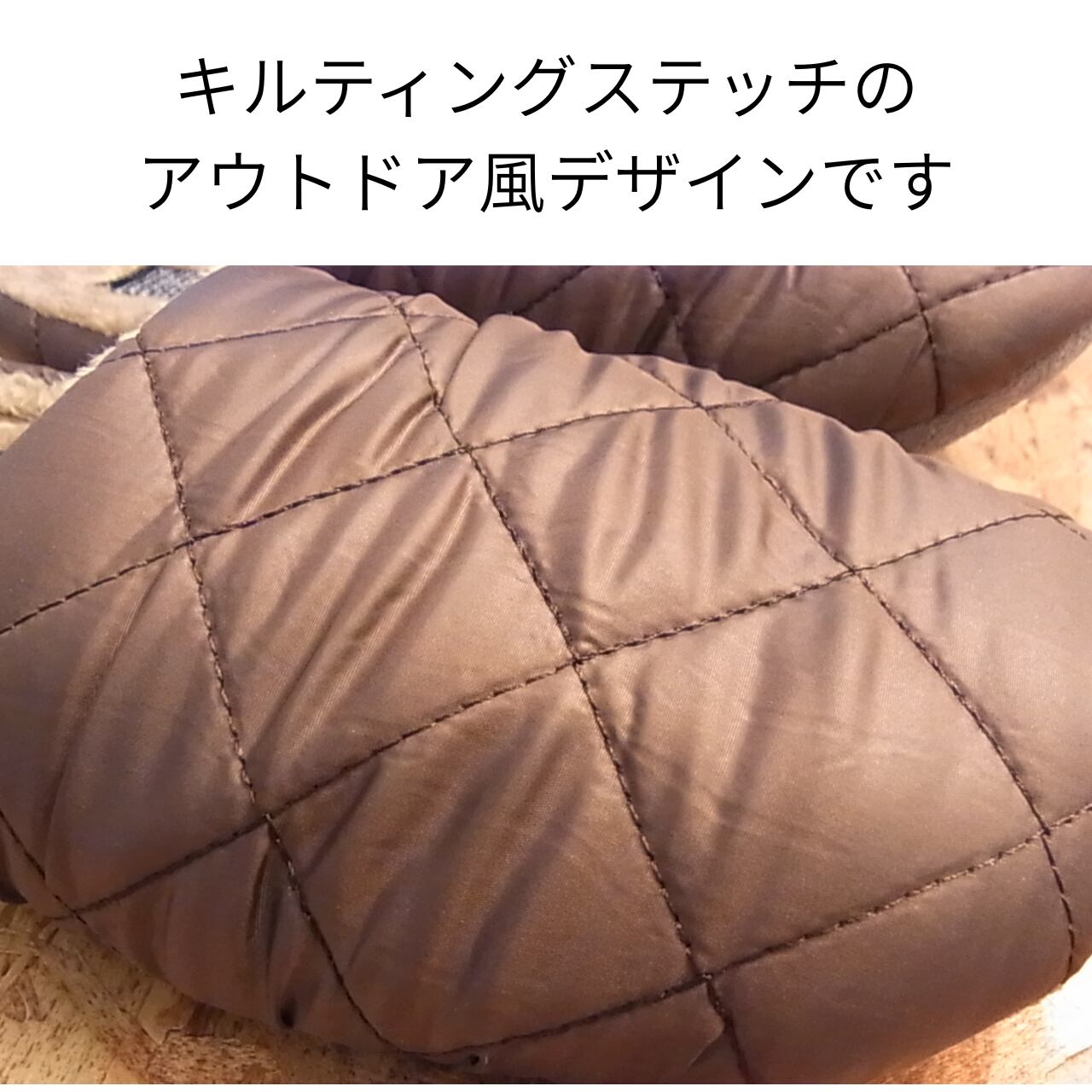 内側は極上のふかふかボア仕様で、冷えた足を優しく、じんわりと温めます。外側はおしゃれなキルティングデザインを採用し、アウトドアライクなスタイルを実現。超軽量設計と、歩いても静かなスエード調の底材で、機能性も抜群です。