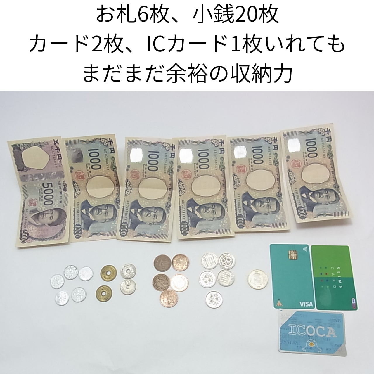 驚きの収納力: 見た目からは想像できない大容量。お札6枚、小銭20枚、カード3枚(ICカード1枚含む)を入れてもまだ余裕の収納力!これだけで身軽に出かけられます。