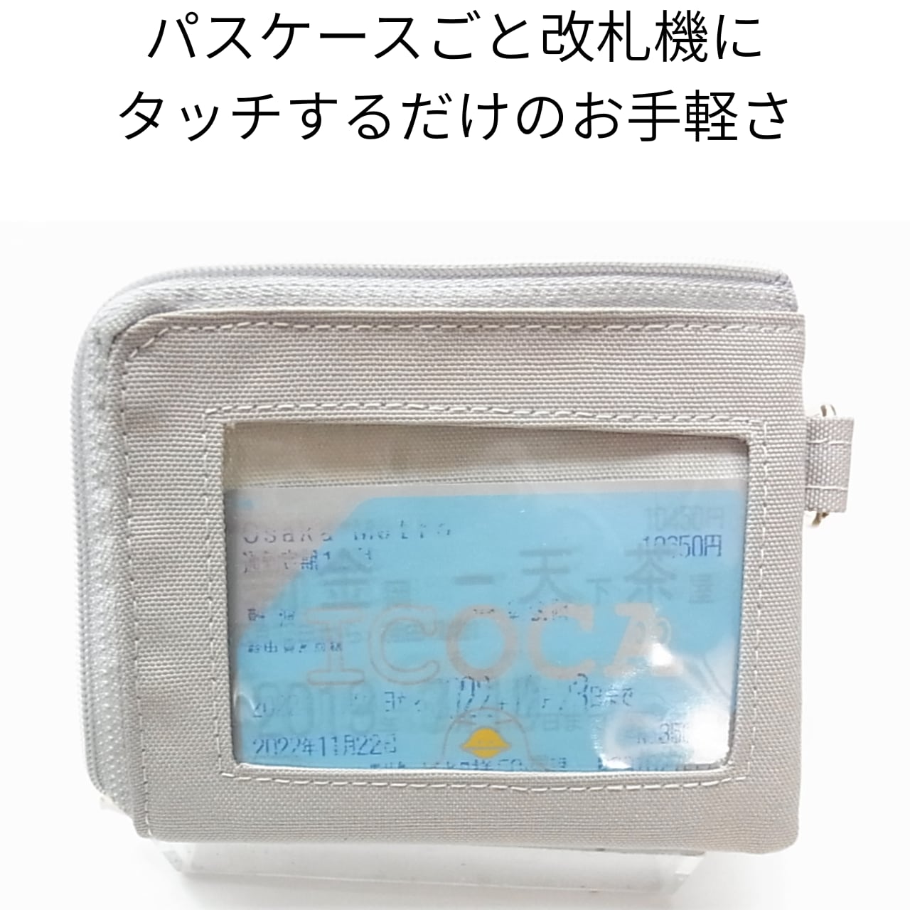 改札もスムーズ: ICカードポケットは透明窓付き。パスケースごと改札機にタッチするだけのお気軽さで、朝の忙しい時間もストレスフリー。